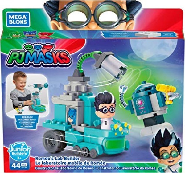 ¡Domina al mundo con Romeo, su robot y laboratorio móvil! Tu pequeño compañero puede ayudar al malvado Romeo a dominar el mundo cuando, juntos, construyan su robot y el laboratorio móvil con la grúa magnética. Construye a su compañero robot y después, el laboratorio y coloca a Romeo dentro para capturar a los PJ Masks de una vez por todas. Tu pequeño constructor puede transformar al robot en la última invención de Romeo, ¡el láser gigante! Ideal para Junior Builders™, edades de 3 años en adelante.