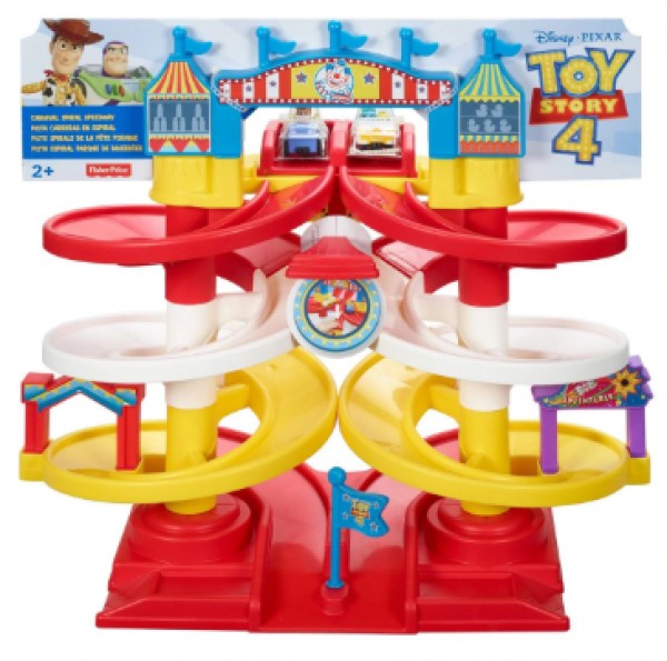 ¡Los niños pequeños pueden recrear la acción de alta velocidad de Disney Pixar Toy Story 4 con el juego Carnival Spiral Speedway! Presiona la palanca para enviar a Woody, Bunny y Ducky a correr por el carnaval, haciendo zoom en las rampas en espiral mientras juegan el carnaval divertido y la montaña rusa.