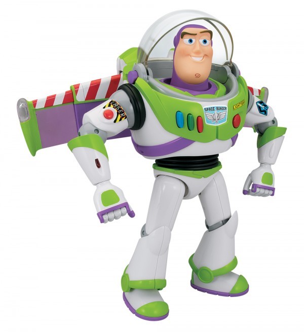 Buzz tiene botones en el pecho para frases clásicas de “Buzz Toy” o para “Space Ranger”, y gira la cabeza mientras habla.